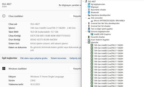İşlemci: Intel Core i7-13620H 10 çekirdek